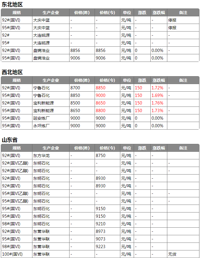| 地区 | 92批发 | 92零售 | 95批发 | 95零售 | 0批发 |